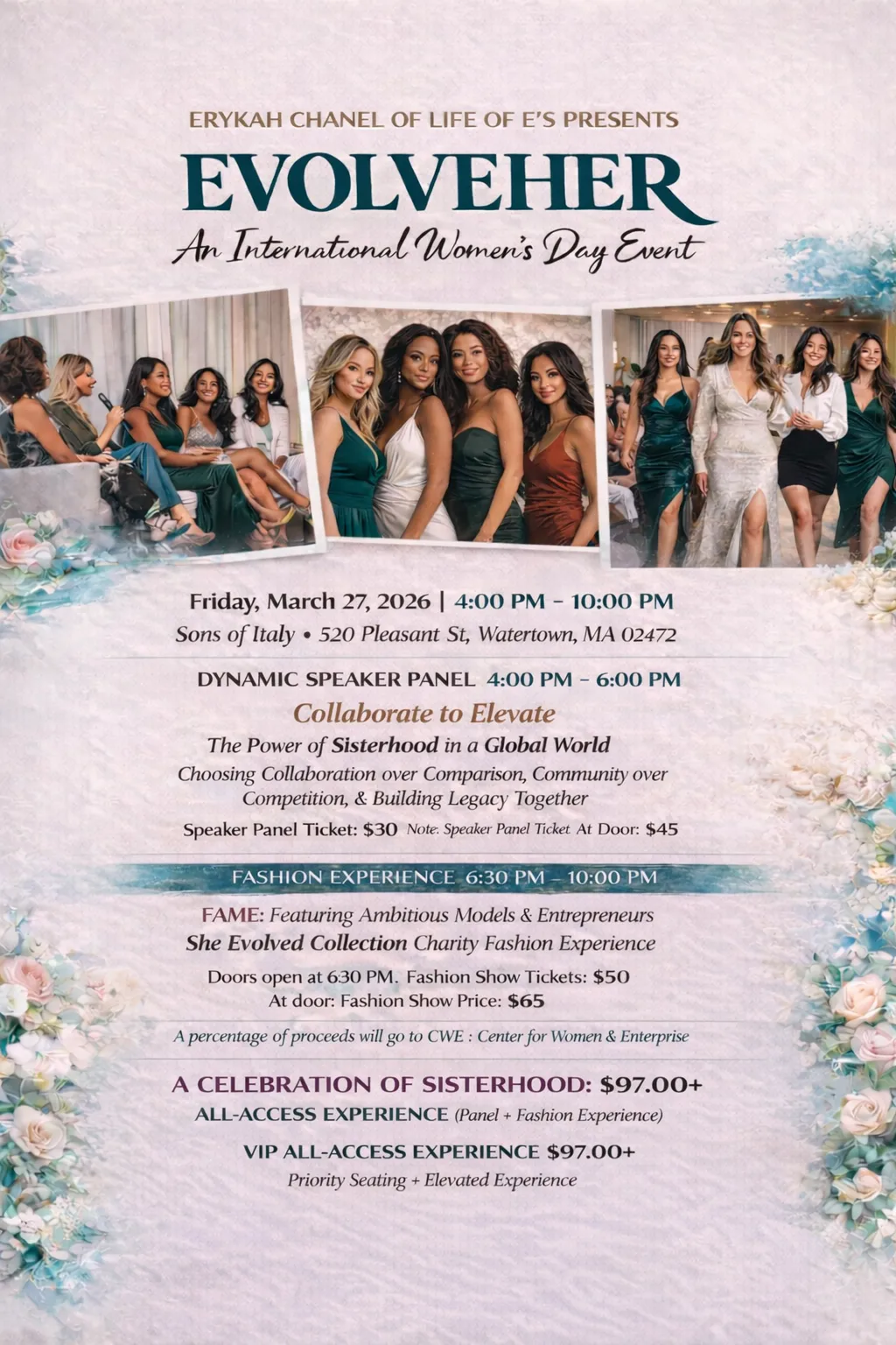EVOLVEHER is a premier women’s empowerment event in Massachusetts featuring the Collaborate to Elevate Speaker Panel and the F.A.M.E Charity Fashion Experience. Designed for women entrepreneurs, creatives, and leaders, this dynamic networking event blends business strategy, leadership development, community connection, and a purpose-driven fashion runway. Join us in Watertown, MA, for an unforgettable evening of collaboration, visibility, and impact.
