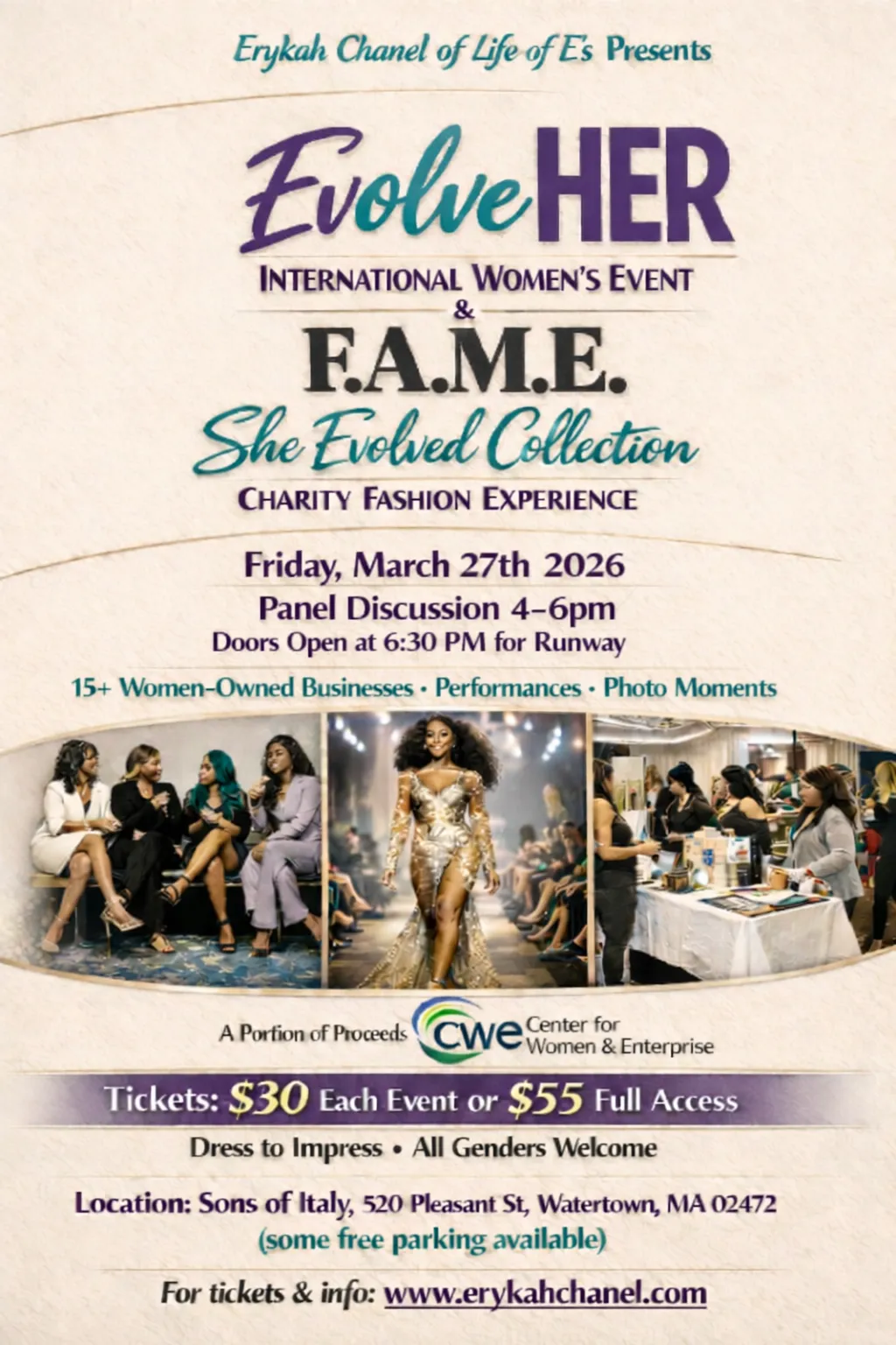 Erykah Chanel is a transformational coach, photographer, speaker, and event producer dedicated to helping women and creatives step into their most confident, aligned, and empowered selves. As the founder of Life of E’s, she guides individuals through personal and professional evolution through her philosophy of Empower, Energize, and Evolve. Erykah is also the producer of the EVOLVEHER International Women’s Event and F.A.M.E. Charity Fashion Experience, creating powerful spaces that amplify women’s voices, visibility, and collaboration in business, creativity, and community.